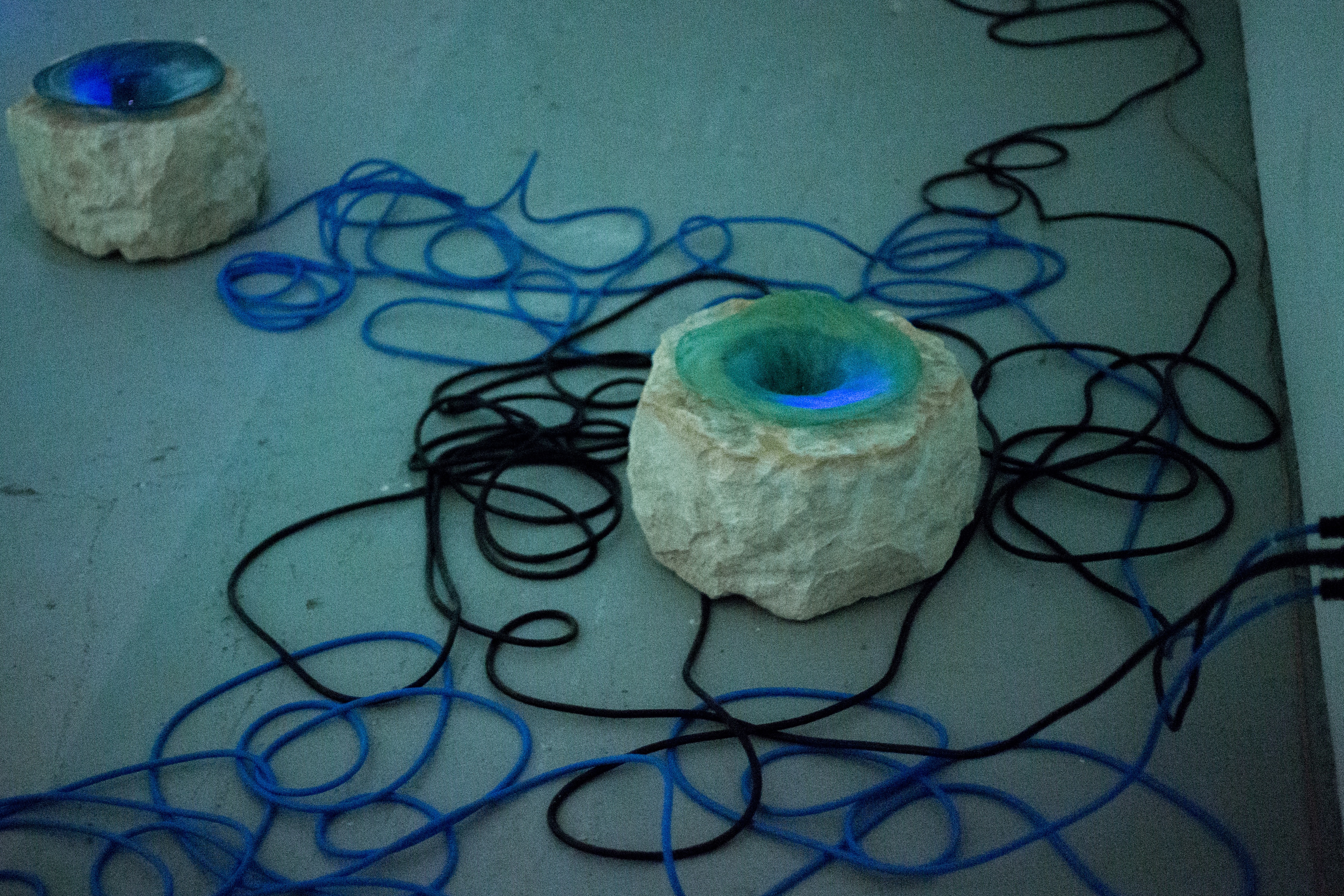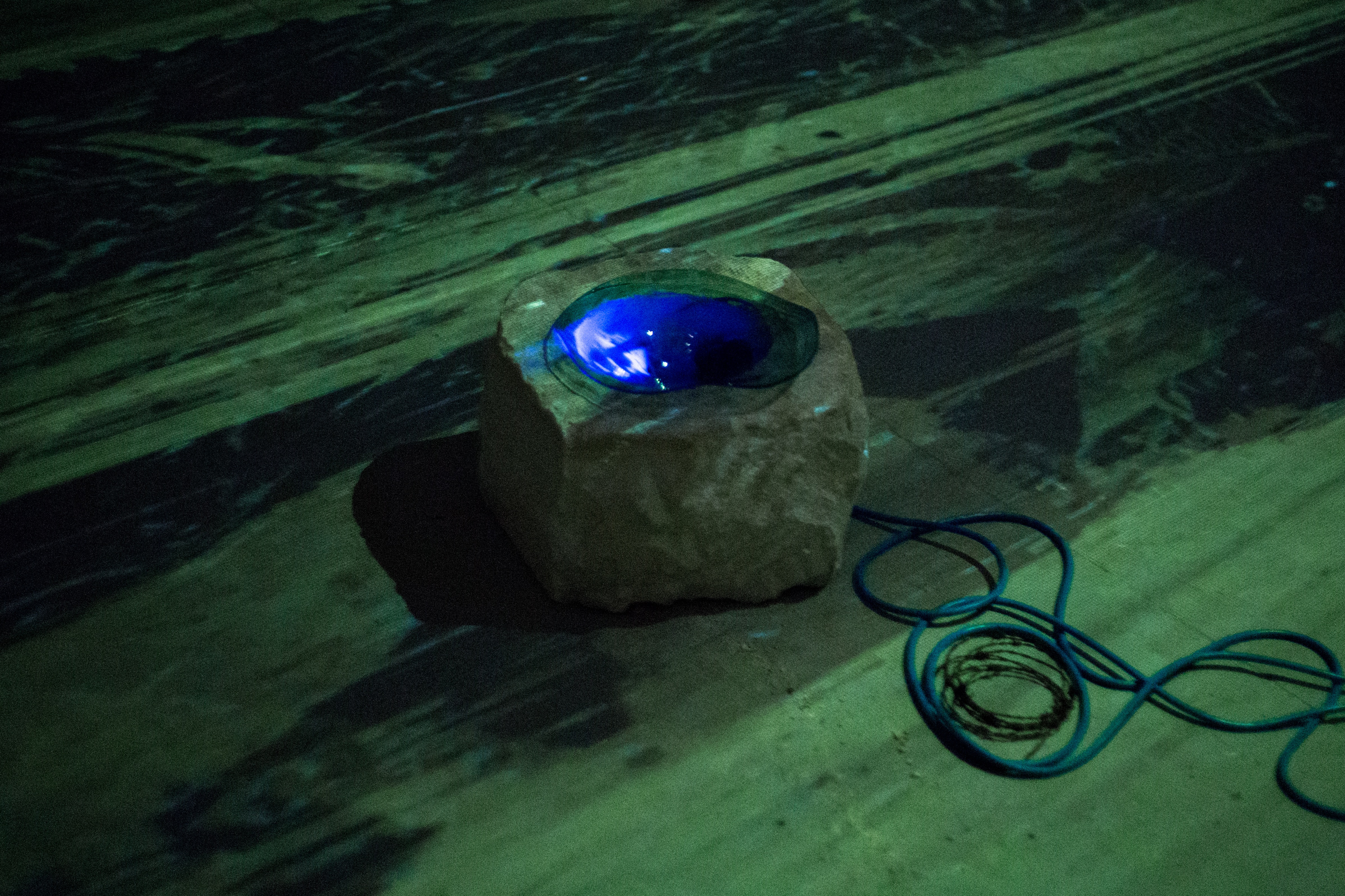Yanaguana Frictions is a large-scale immersive installation reflecting on the 12,000+ year material and cultural history of the San Antonio River. Botello engineered seven sculptures out of Bexar-county limestone and glass that resonate recordings made with a hydrophone from several significant sites along the River — at the Headwaters/Blue Hole, the Pump House at Brackenridge Park, the heart of the Riverwalk, the water-powered grain mill at Mission San José, and the Espada Dam/acequia. Also featured — a community gathered multi-voice choral work (composed in Nahuatl, Spanish, German, and English; edited to amplify only the breaths between singing and speaking; engineered to sound through the walls of the site), field recordings of local cicadas, a digital projection of 16mm film (submerged blank into the River for the water to develop the reel), objects collected from walks along the 240 mile length of the River (petrified wood, clay pottery shards, glass, rusted metal, barbed wire), a ceramic sculpture of St. Anthony ("San Antonio"), limited edition zines, and prints of film stills. Commissioned by S.M.A.R.T. for their SA 300 San Antonio Tricentennial Celebration Residency.